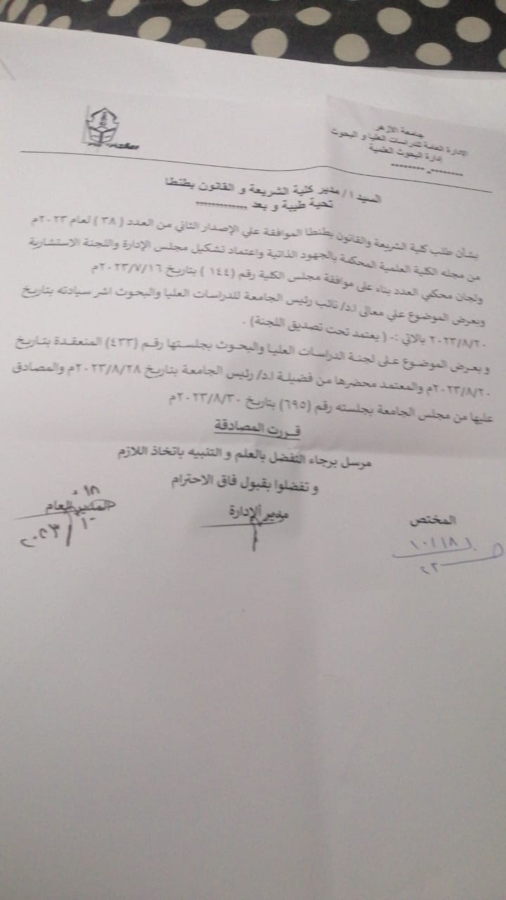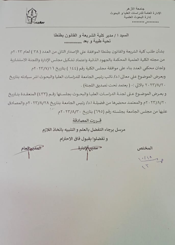 . موافقة الإصدار الثاني من العدد 38. مجلة کلية الشريعة و القانون بطنطا, 2023; 38(2): -. doi: 10.21608/mksq.2023.322055